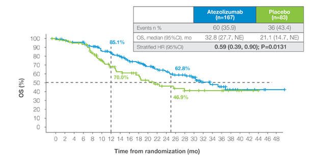 - 41% reduction in risk of recurrence or death (OS HR 0.59)1
