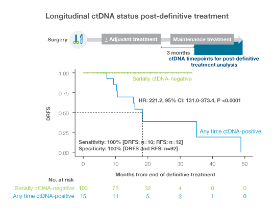ctDNA status in conjunction with existing tools after surgery and adjuvant chemotherapy identified high risk patients with poor recurrence-free survival8 who may benefit from adjuvant treatment for high risk individuals